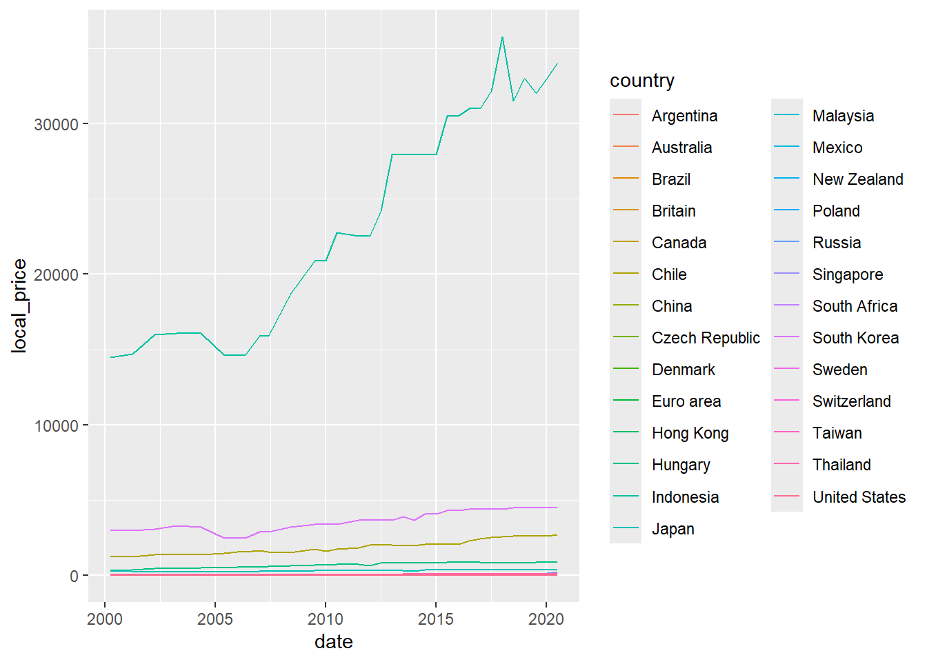This data is from Tidy Tuesday. I am going to load the data up, it’s an S3 object then extract the data I want out to a data frame that is just the big mac data.